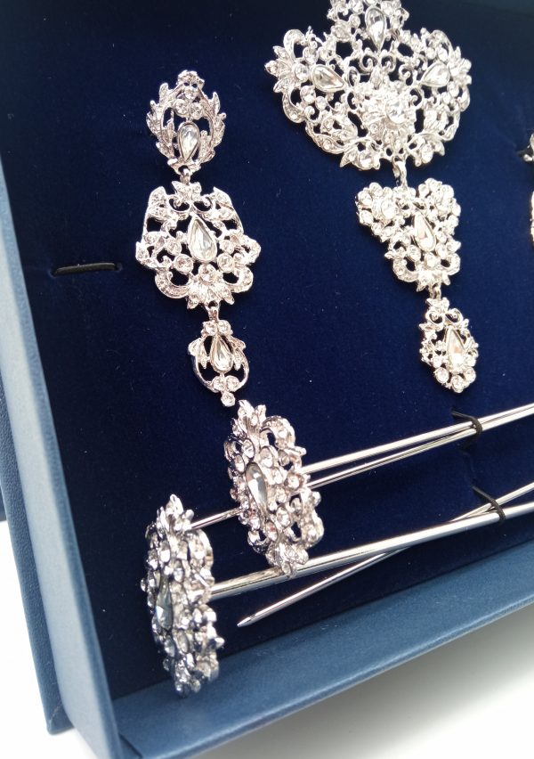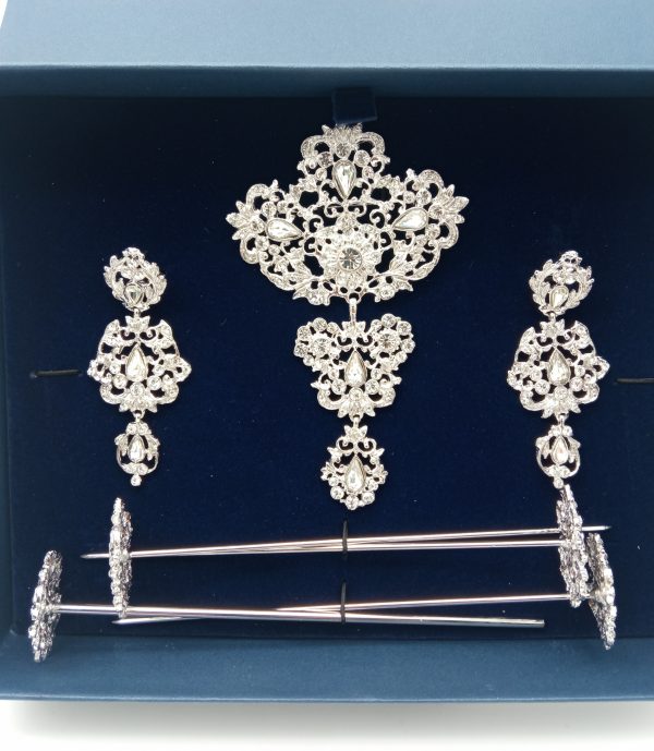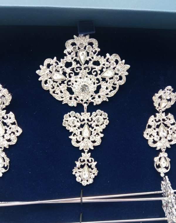 Precioso aderezo que nos evoca a una época rica en joyería artesanal. Conjunto formado por siete piezas de influencia mediterránea. Con complejas filigranas y zirconitas en pendientes y broche, que darán a tu traje un estilo elegante y selecto.