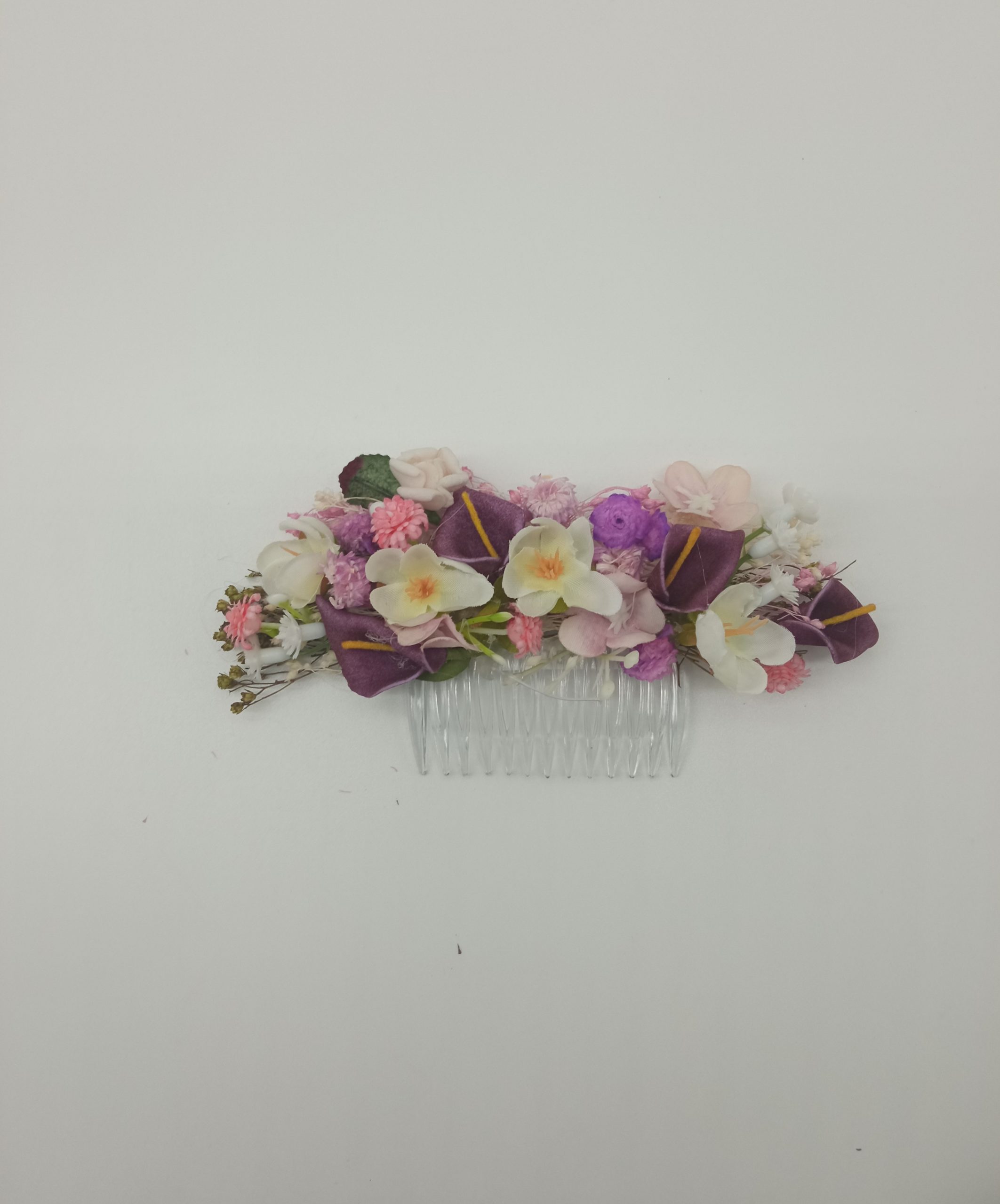 Precioso tocado de flores elaborado artesanalmente con flores artificiales.