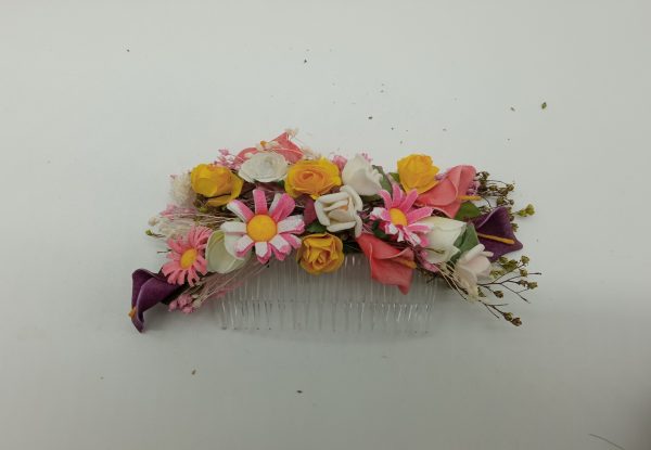 Precioso tocado de flores elaborado artesanalmente con flores artificiales. Incluye peineta para su perfecta sujeción.