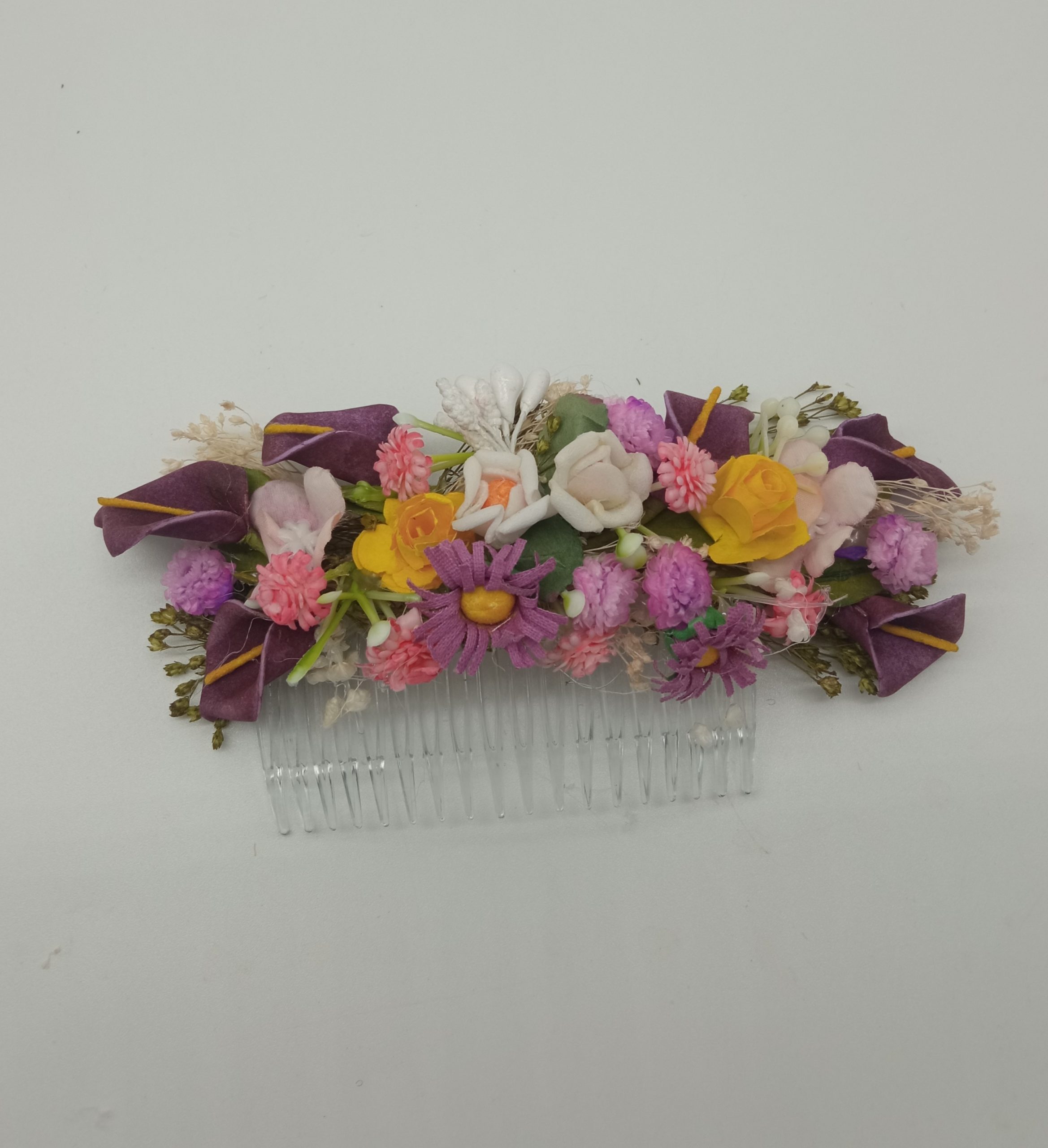 Precioso tocado de flores elaborado artesanalmente con flores artificiales y preservadas.
